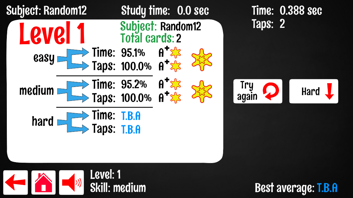Memtap has 12 Subjects divided into 124 levels. In each level you will be graded( A+ , A, B+, B...etc) for accuracy and speed in matching pairs.